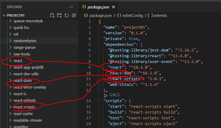 -> package.json에는 실제로 여기에 어떤 패키지들이 설치되었는지를 표시해주는 것이고, 설치되는 경로는 node modles 폴더이다.