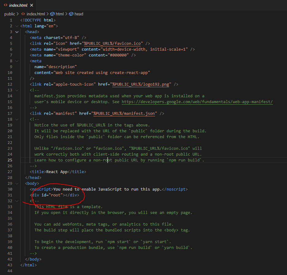 -> public 폴더에 index.html이 있는데, 웹사이트에서 정보를 제공할 때 html을 사용하는데 React로 만들어진 웹 사이트를 열면 제일 먼저 가져오는게 index.html 이다. 우리가 작성한 javascript 코드들은 <그림2>의 root라는 곳에 전부 들어가게 된다.