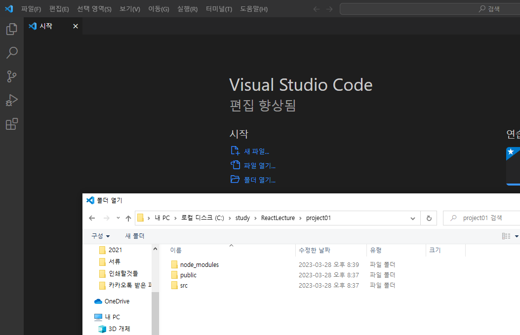 2. react 프로젝트 만든 폴더로 들어가서 열기
