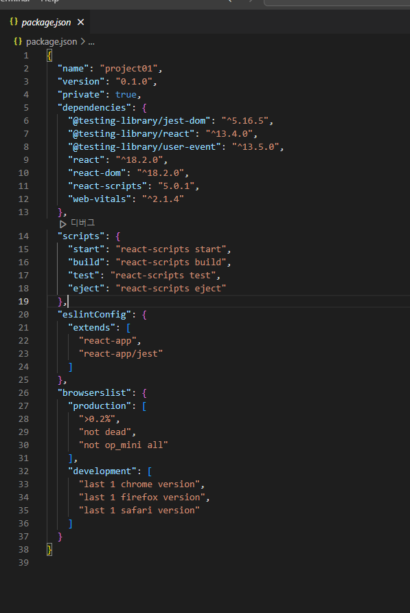 -> 또, "scripts"를 보면 "start", "build", "test", "eject"가 있는데 이전 게시글에서 npm start로 react app을 실행시켰던 것을 생각해보자. 해당 내용에 대한 것을 여기 기술해놓은 것이다. ㅎㅎ